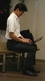 (写真)姿勢があまりに秀逸なサラリーマンを発見!この写真は私の事務所に飾っておこう。